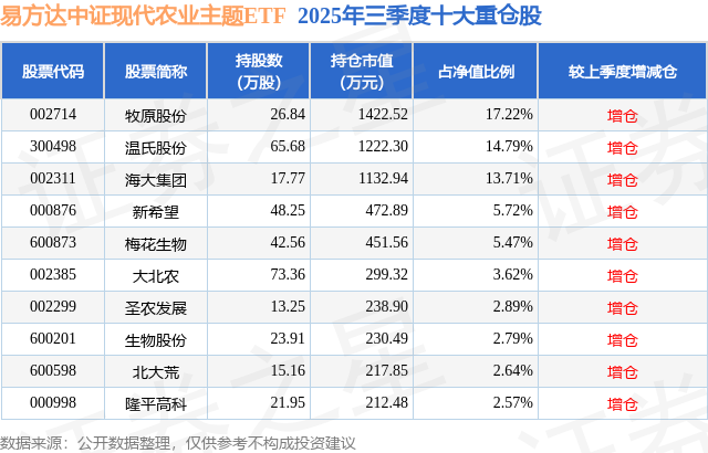从基金边界来看,易方达中证当代农业主题ETF基金2025年三季度公布的基金边界为0.83亿元,较上一期边界6945.81万元变化了1316.28万元,环比变化了18.95%。该基金最新一期金钱配置为:股票占净值比99.34%,无债券类金钱,现款占净值比0.72%。从基金执仓来看,该基金当季前十大股票仓位达71.42%,第一大重仓股为牧原股份(002714),执仓占比为17.22%。